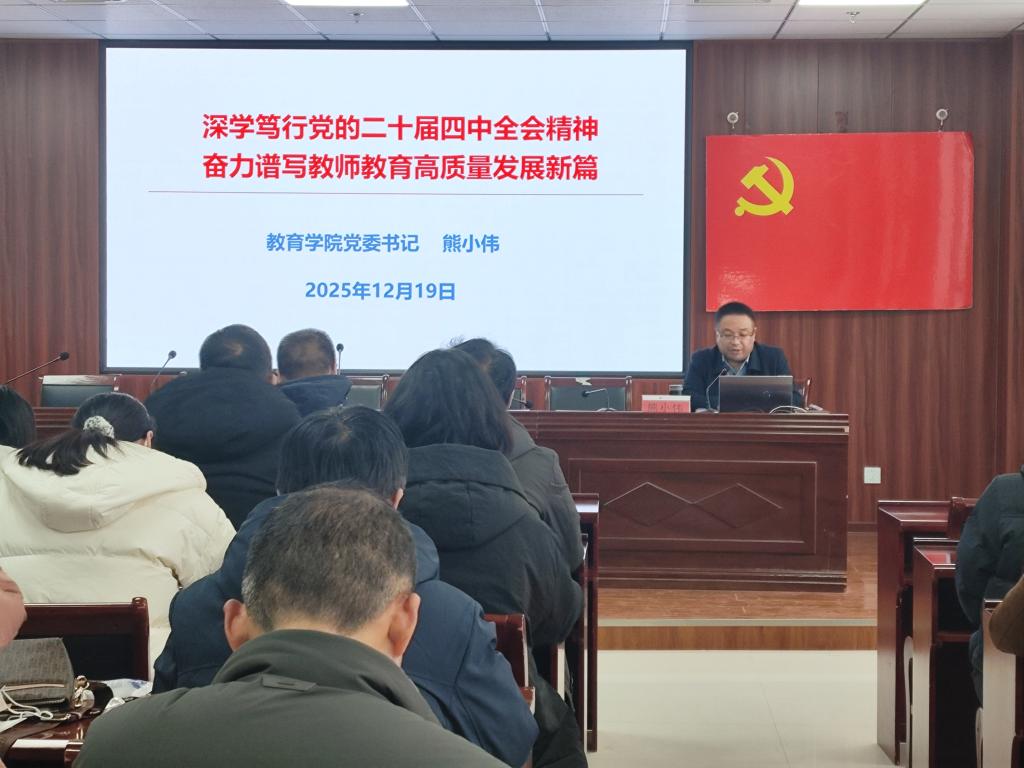 报告会上,熊小伟以《深学笃行党的二十届四中全会精神,奋力谱写教师教育高质量发展新篇》为题,从党的二十届四中全会的重大意义、形势判断、核心要义、贯彻落实四个维度深入解读。熊小伟指出,党的二十届四中全会是我们党在向第二个百年奋斗目标进军新征程上举行的一次十分重要的会议,对统筹教育强国、科技强国、人才强国建设具有重大而深远意义。熊小伟强调,坚持党的领导是办好中国特色社会主义大学的根本保证。要通过把坚持和加强党的全面领导贯穿办学育人各环节全过程,切实把党的政治优势组织优势转化为发展优势治理效能,以高质量党建引领学院事业高质量发展。同时结合学院发展实际与专业特色,对全院师生提出希望与要求:一是把握时代方位,融入发展大局。要自觉将个人追求和育人实践置于教育强国建设大格局中,深刻认识教师教育在强国建设、民族复兴中的战略意义。二是坚守育人初心,厚植家国情怀。要始终牢记“为党育人、为国育才”初心使命,以坚定的理想信念投身教师教育事业。三是主动担当作为,锤炼过硬本领。要积极顺应多元化培养、智能化赋能、融合化育人新形势新要求,科学识变应变求变,做新人才培养模式改革,做深信息技术融合应用,做好协同育人格局共建,着力擦亮教师教育办学底色。