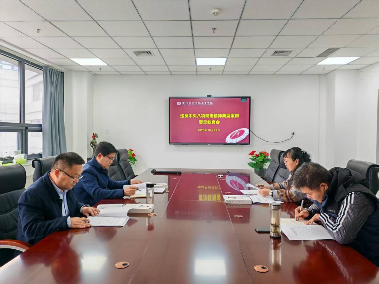为深入推进党纪学习教育常态化长效化,持续加固中央八项规定精神堤坝,10月23日下午,教育学院在明园四号楼B221会议室召开违反中央八项规定精神典型案例警示教育会。学院在校领导班子、党委委员参加会议,会议由党委书记熊小伟主持。