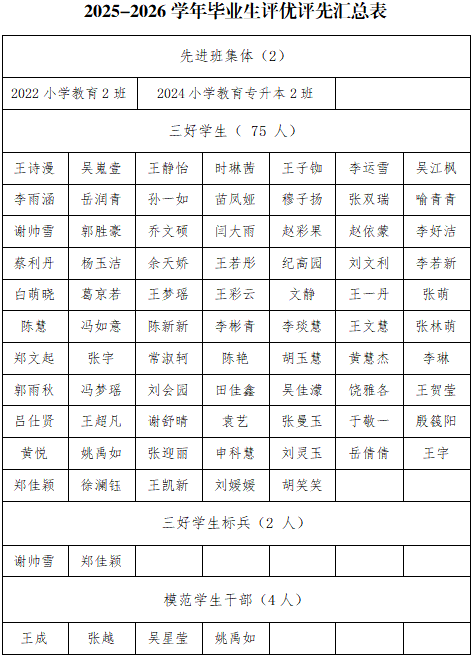 根据安阳师范学院《关于做好2026届毕业生2025-2026学年评优评先工作的通知》,结合《安阳师范学院学生奖励规定》中各有关奖项的评选条件,经本人申请,院系综合审议评定,现将教育学院2025-2026学年毕业生评优评先公示名单公示如下。